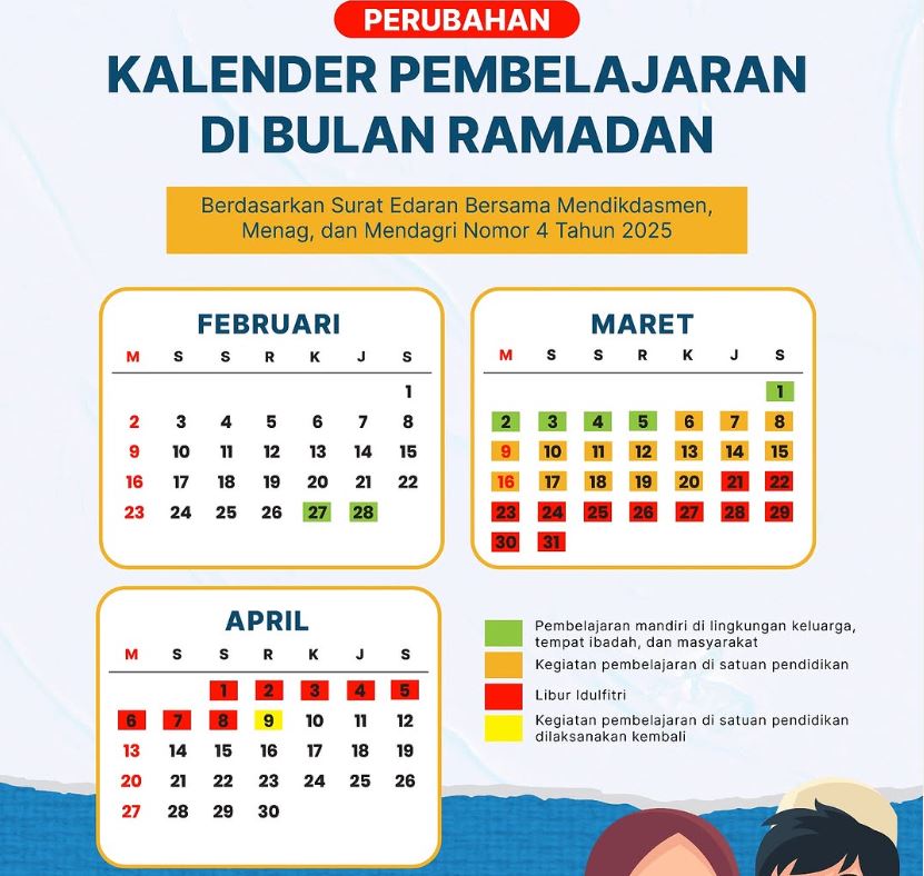 Informasi tersebut tercantum dalam Surat Edaran Bersama (SEB) Menteri Pendidikan Dasar dan Menengah Republik Indonesia, Menteri Agama Republik Indonesia, dan Menteri Dalam Negeri Republik Indonesia Nomor 4 Tahun 2025, Nomor 9 Tahun 2025, dan Nomor 400.6/1432.A/SJ tentang Pembelajaran di Bulan Ramadan. (3/3).